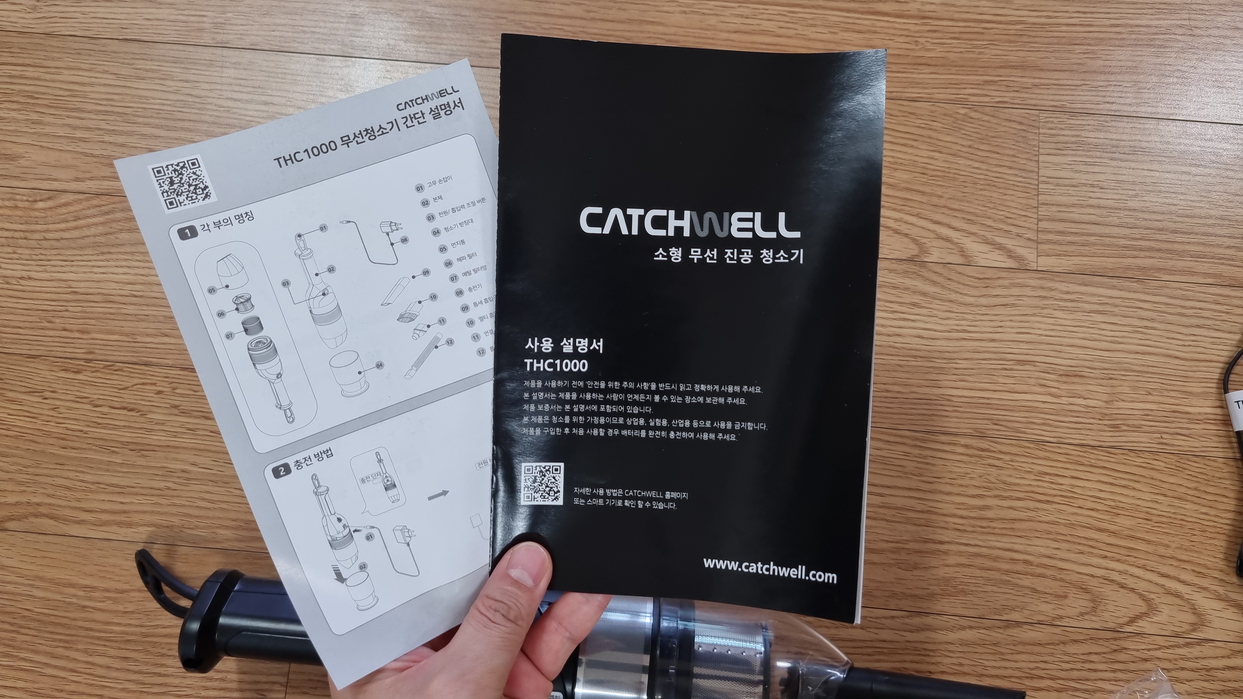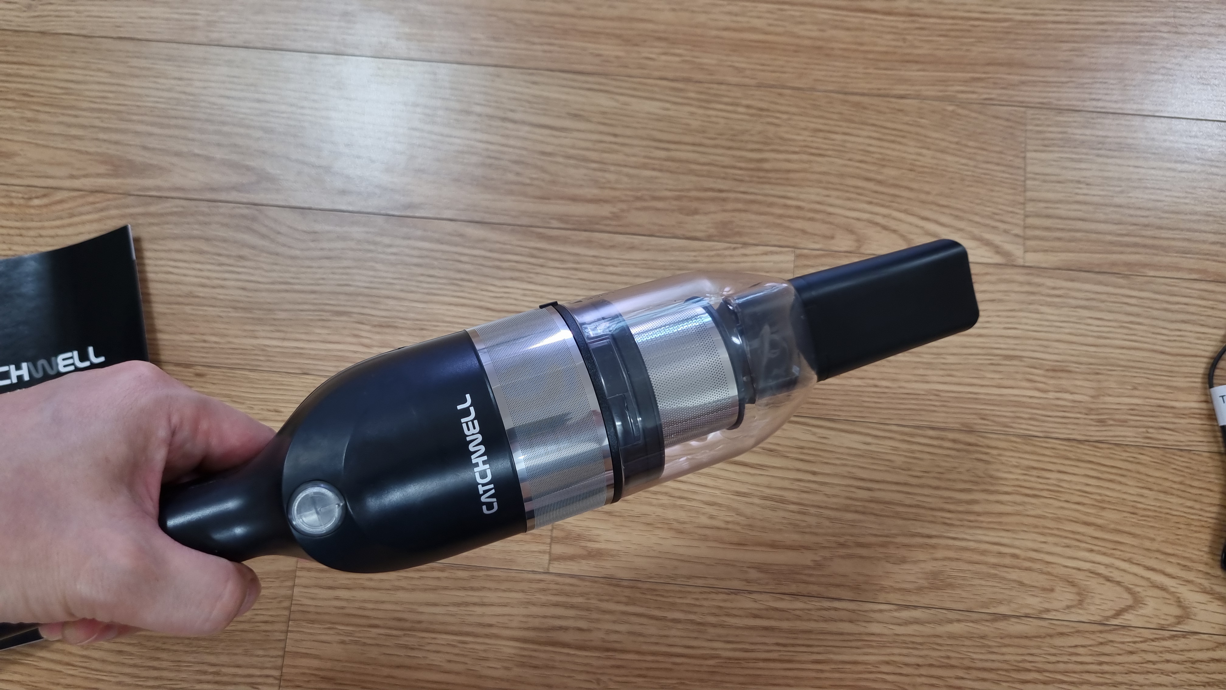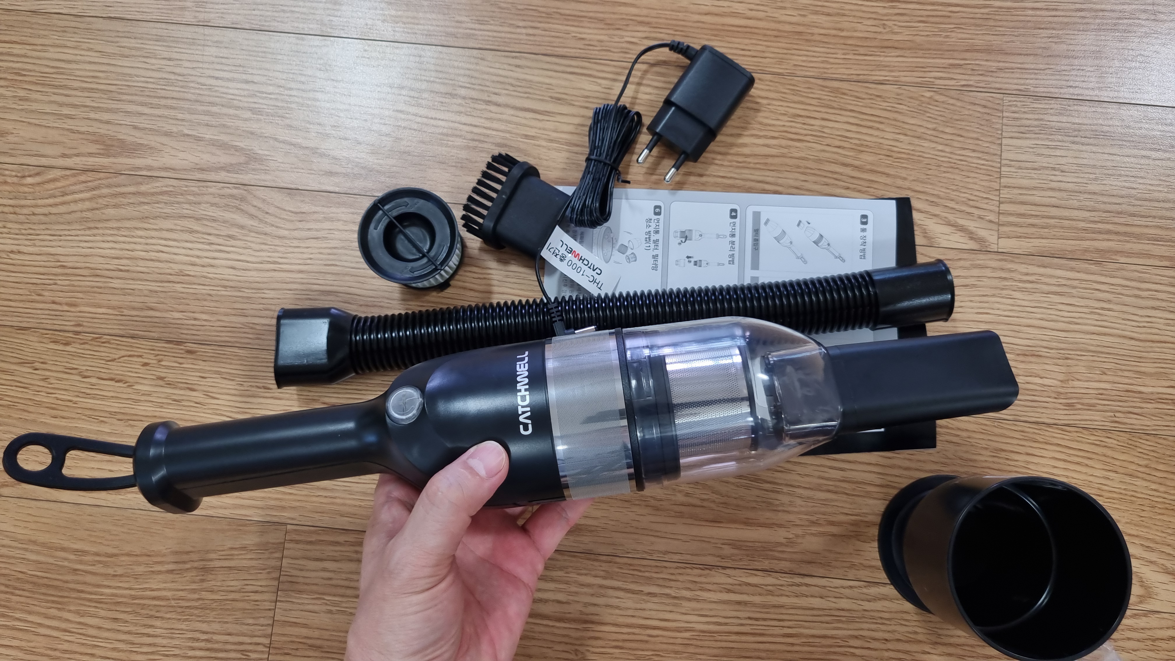 이것은 캐치웰 THC1000 핸디형 무선 청소기입니다. 이 제품은 텀블러 디자인으로 되어 있으며, 차량이나 책상 주변 등 다양한 곳에서 편리하게 사용할 수 있습니다.